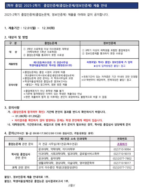 [졸업] 2025-2학기 학부 졸업인증제(논문/정보 능력 인증) 제출 시행